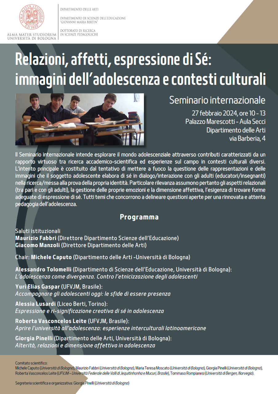 Il Seminario internazionale intende esplorare il mondo adolescenziale attraverso contributi caratterizzati da un rapporto virtuoso tra ricerca accademico-scientifica ed esperienze sul campo in contesti culturali diversi. L’intento principale è costituito dal tentativo di mettere a fuoco la questione delle rappresentazioni e delle immagini che il soggetto adolescente elabora di sé in dialogo/interazione con gli adulti (educatori/insegnanti) nella ricerca/messa alla prova della propria identità. Particolare rilevanza assumono pertanto gli aspetti relazionali (tra pari e con gli adulti), la gestione delle proprie emozioni e la dimensione affettiva, l’esigenza di trovare forme adeguate di espressione di sé. Tutti temi che concorrono a delineare questioni aperte per una rinnovata e attenta pedagogia dell’adolescenza.